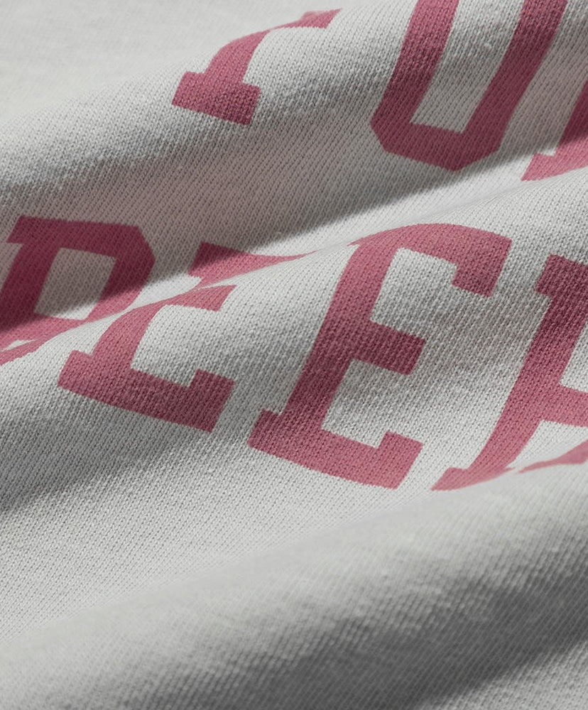 With an ice grey background and subdued pink print, this T-shirt can be worn in any season.