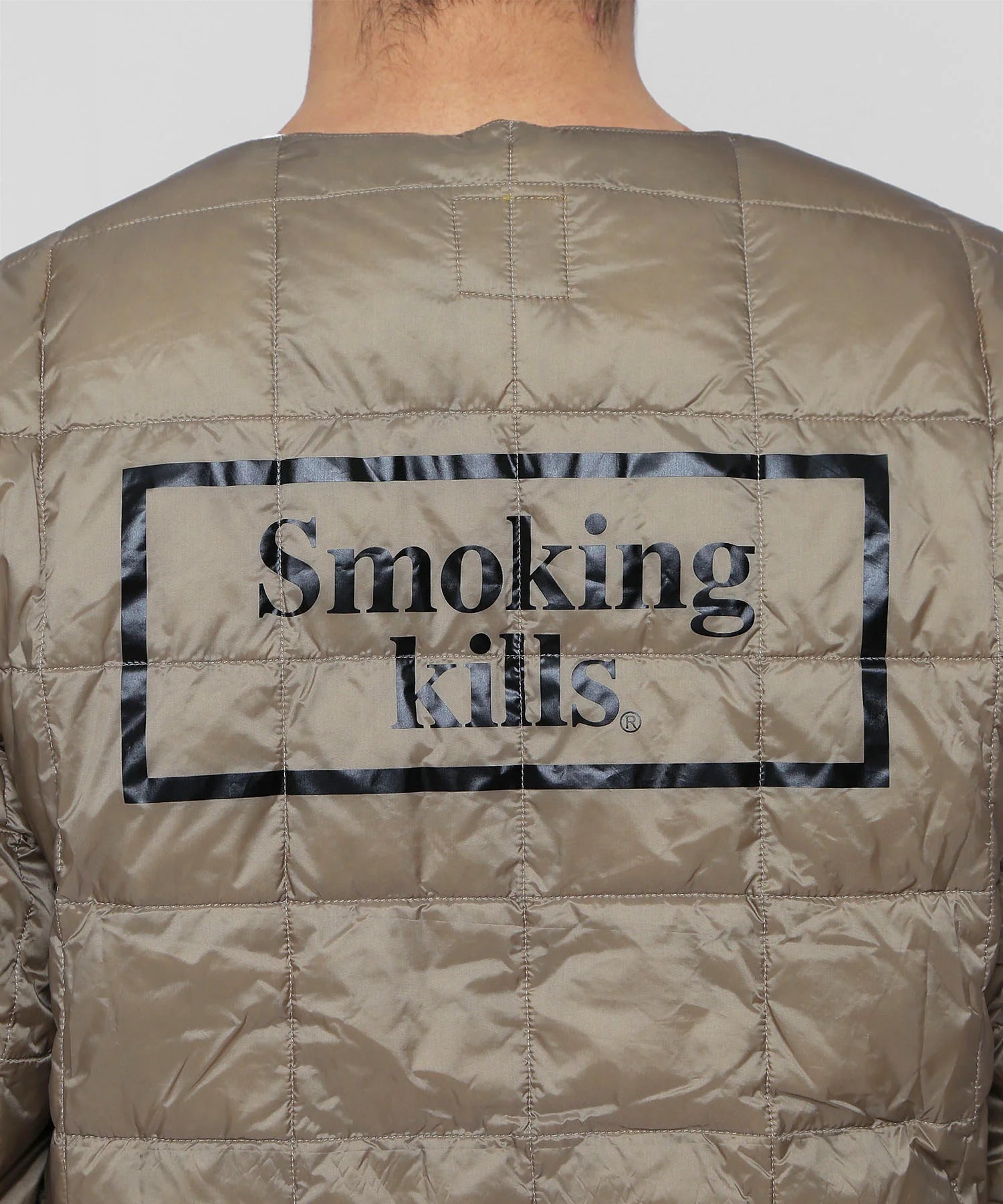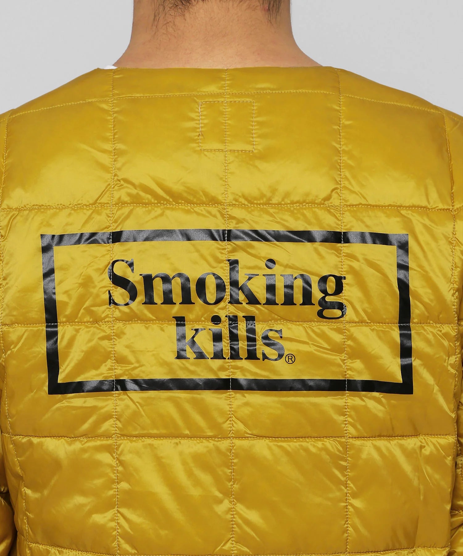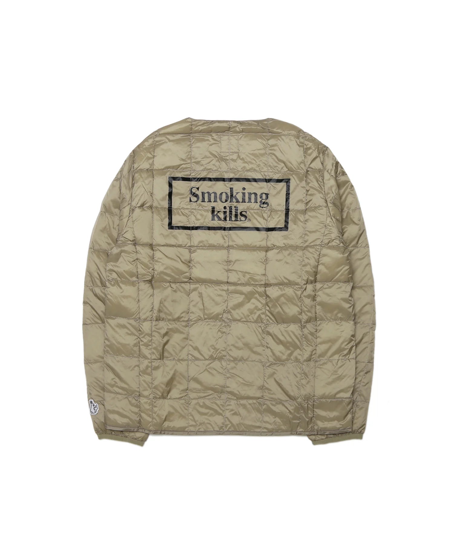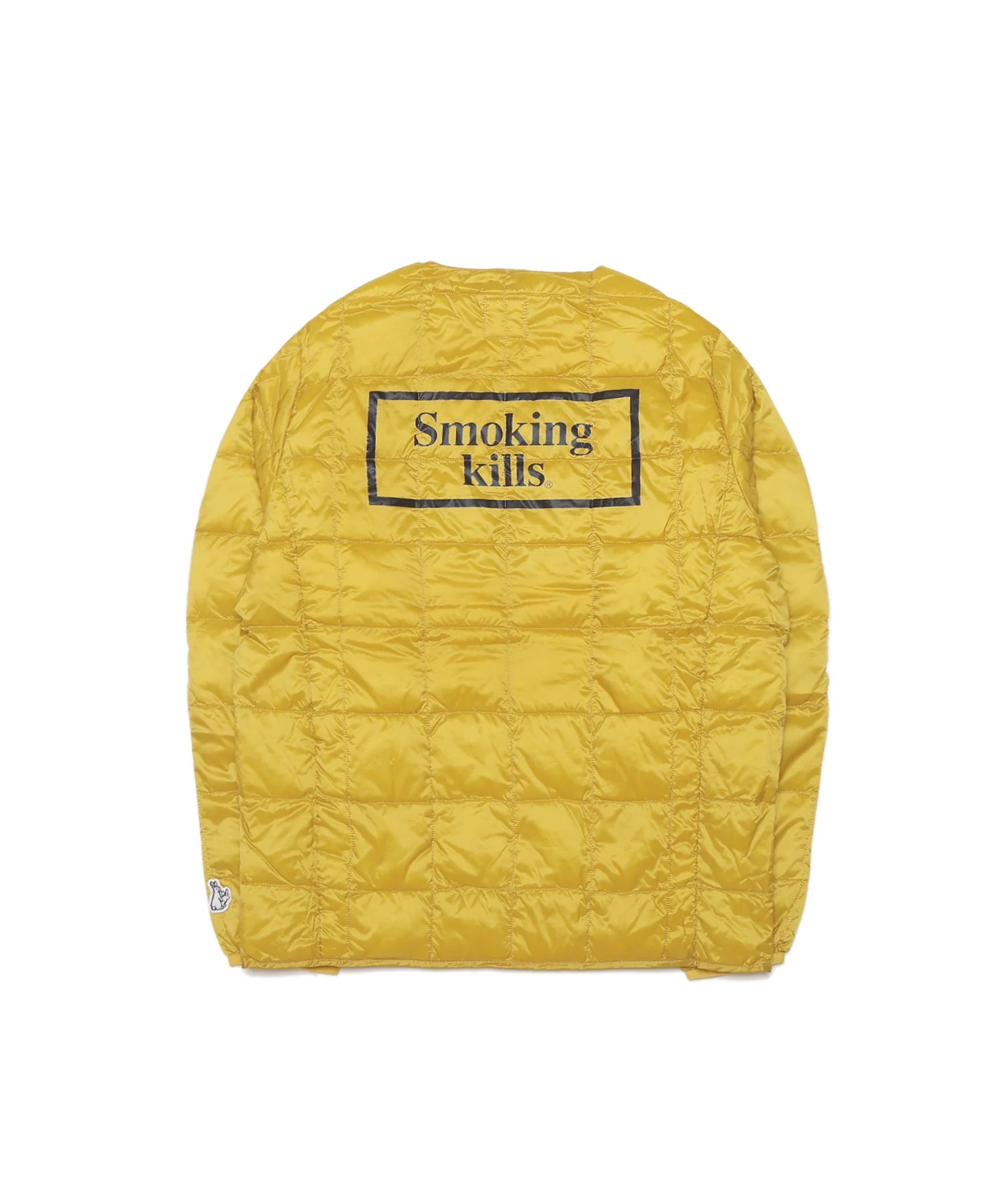 A collaboration item with the inner downwear brand "TAION" is now available. A simple design with the Smoking kills box logo on the back to make it easier to coordinate when worn as an inner down. It is a lightweight yet warm item by using 90% of down.