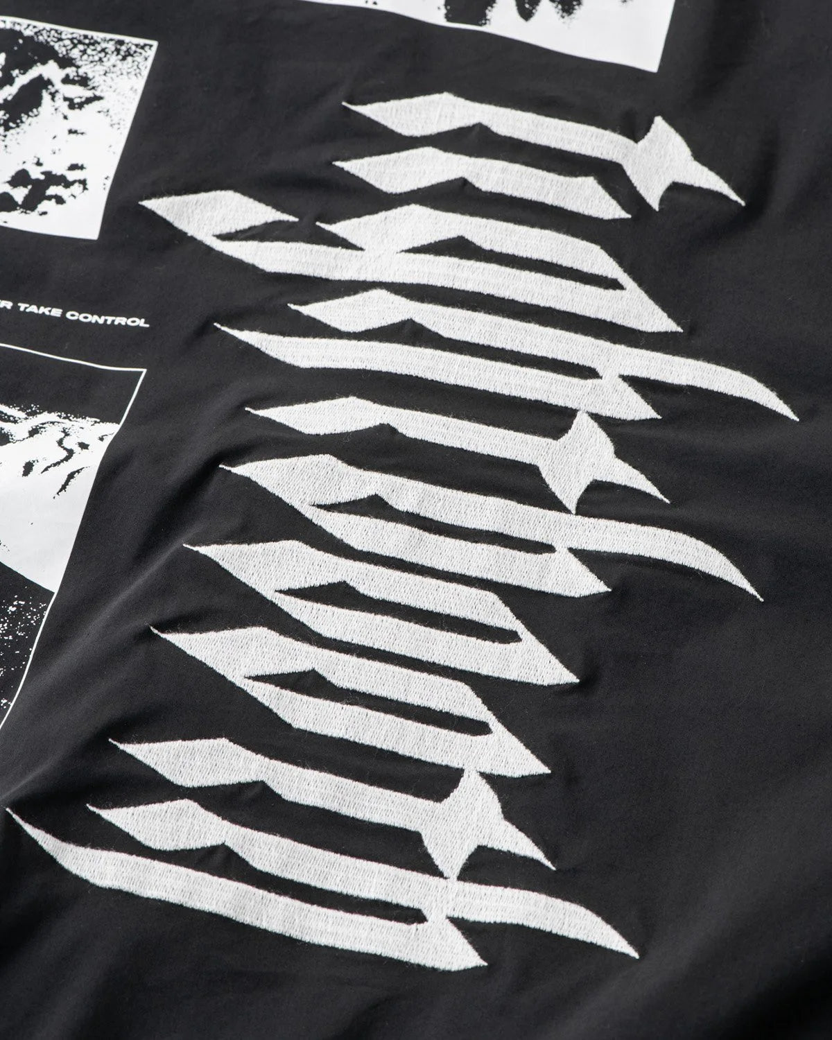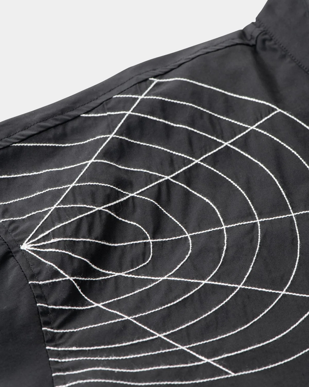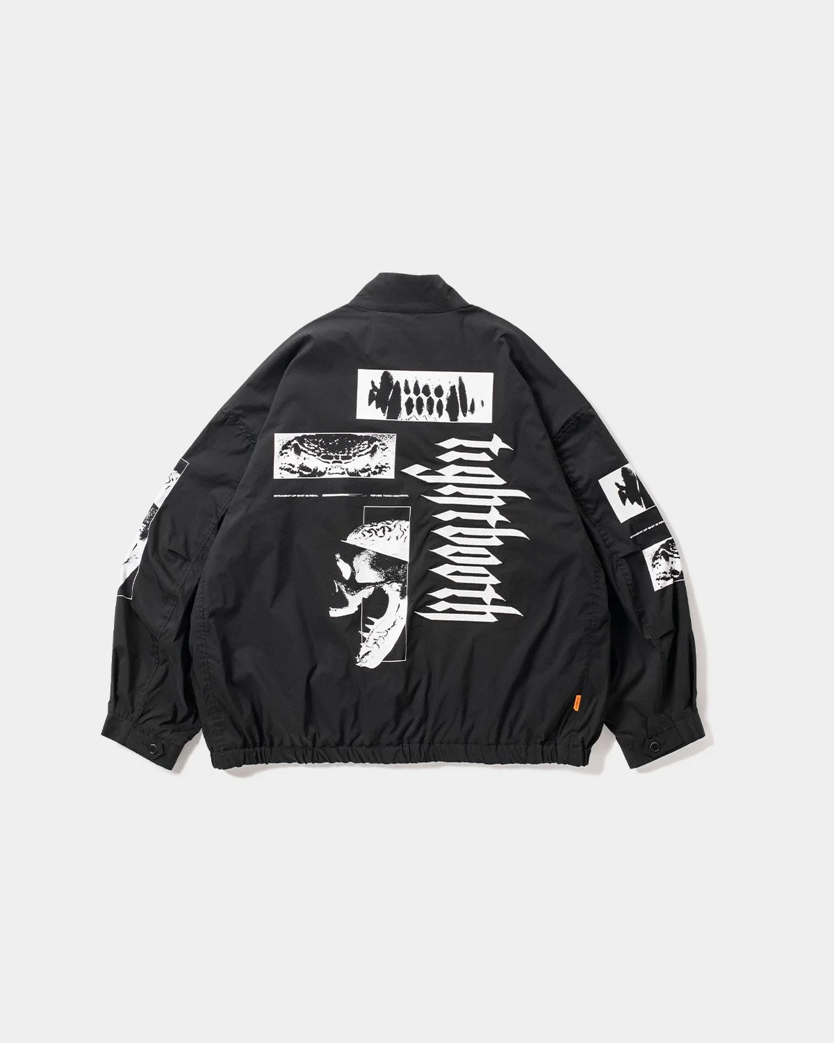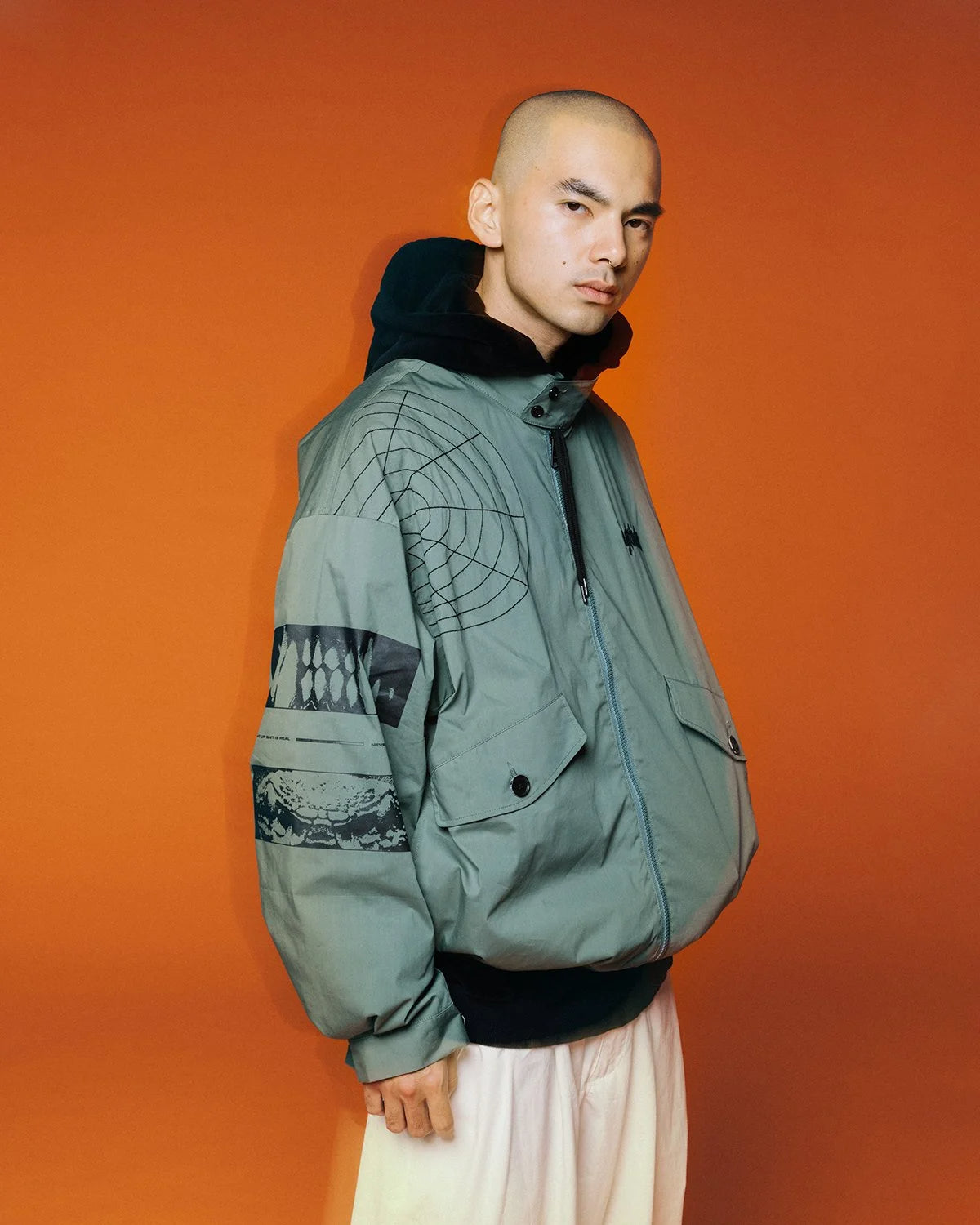 The front has a double zip design, with a logo embroidered on the left chest and a spider stitch design on the right shoulder.