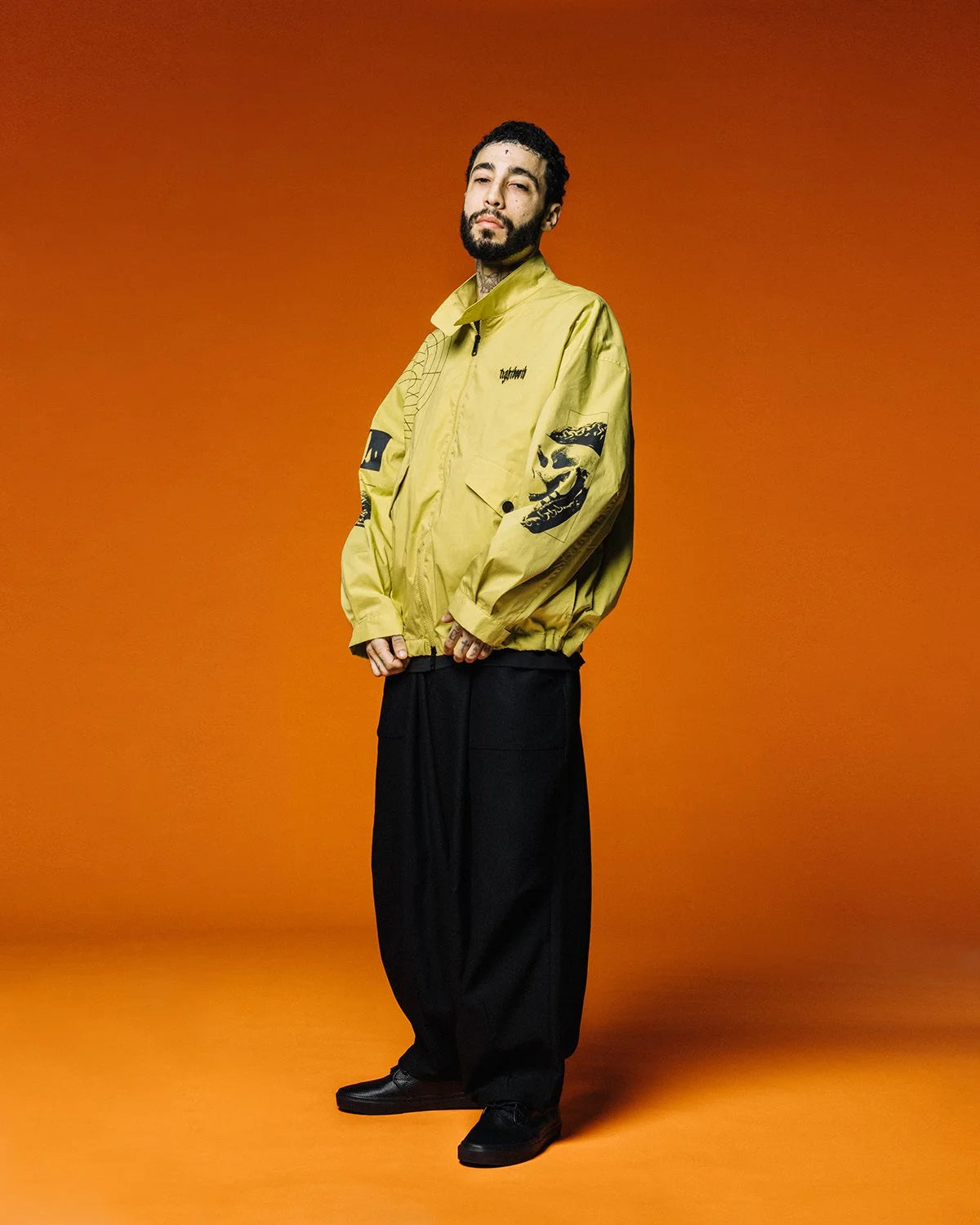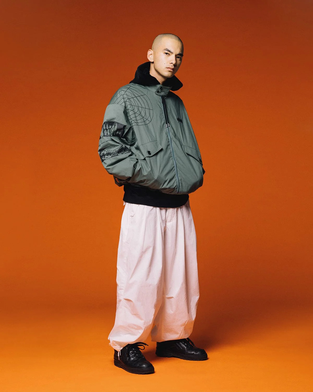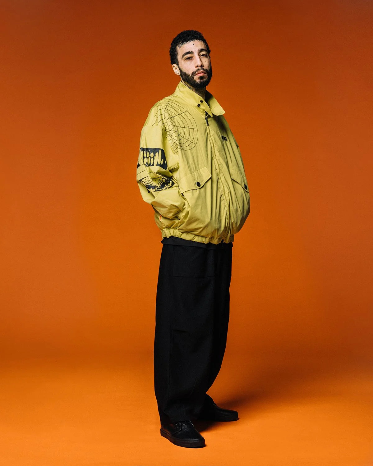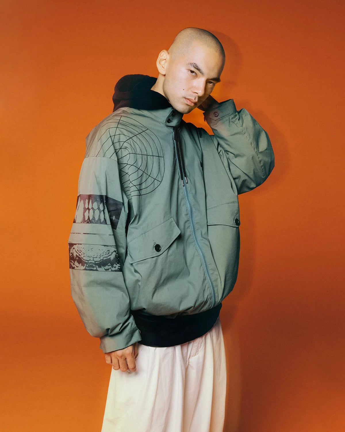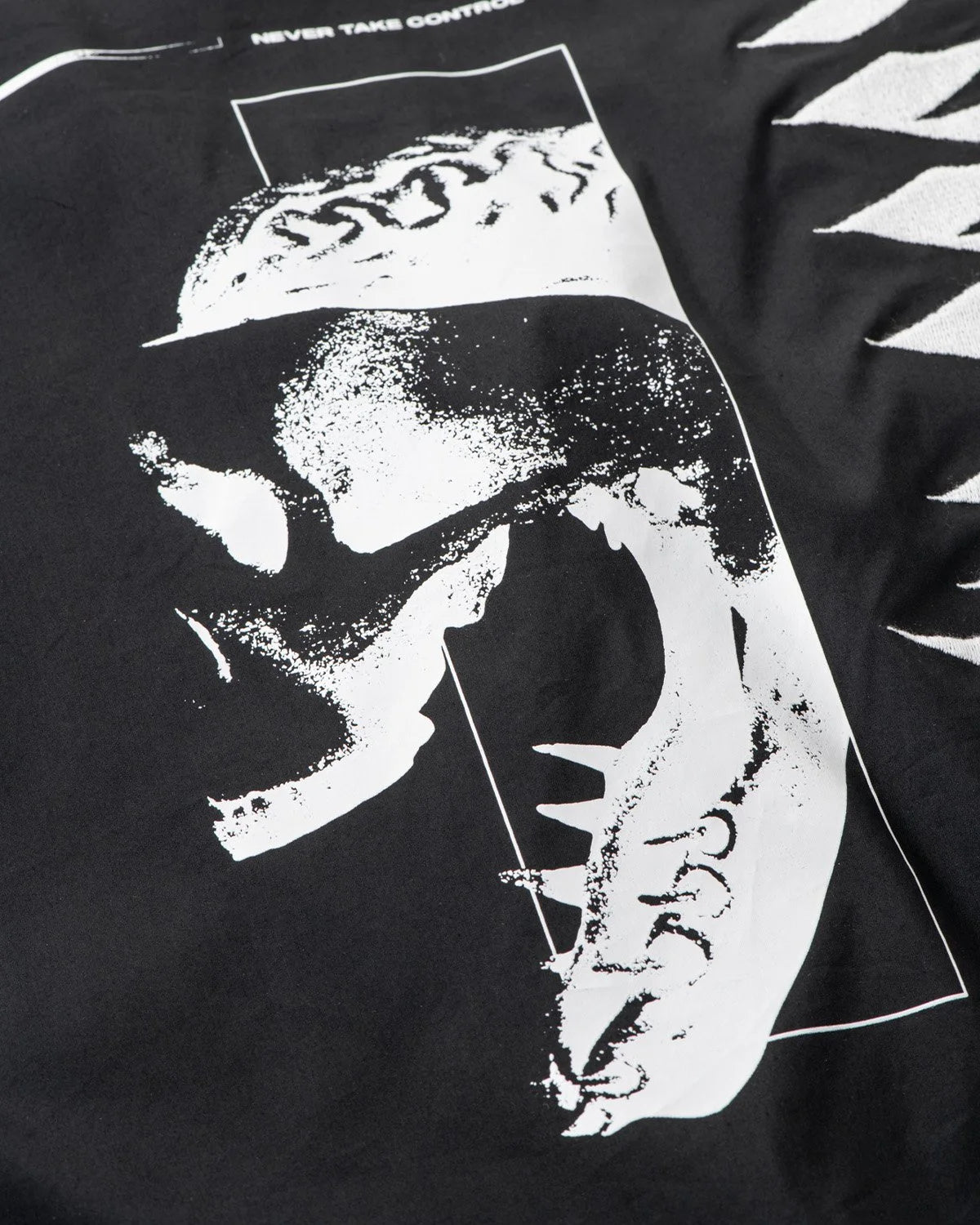 The front has a double zip design, with a logo embroidered on the left chest and a spider stitch design on the right shoulder.