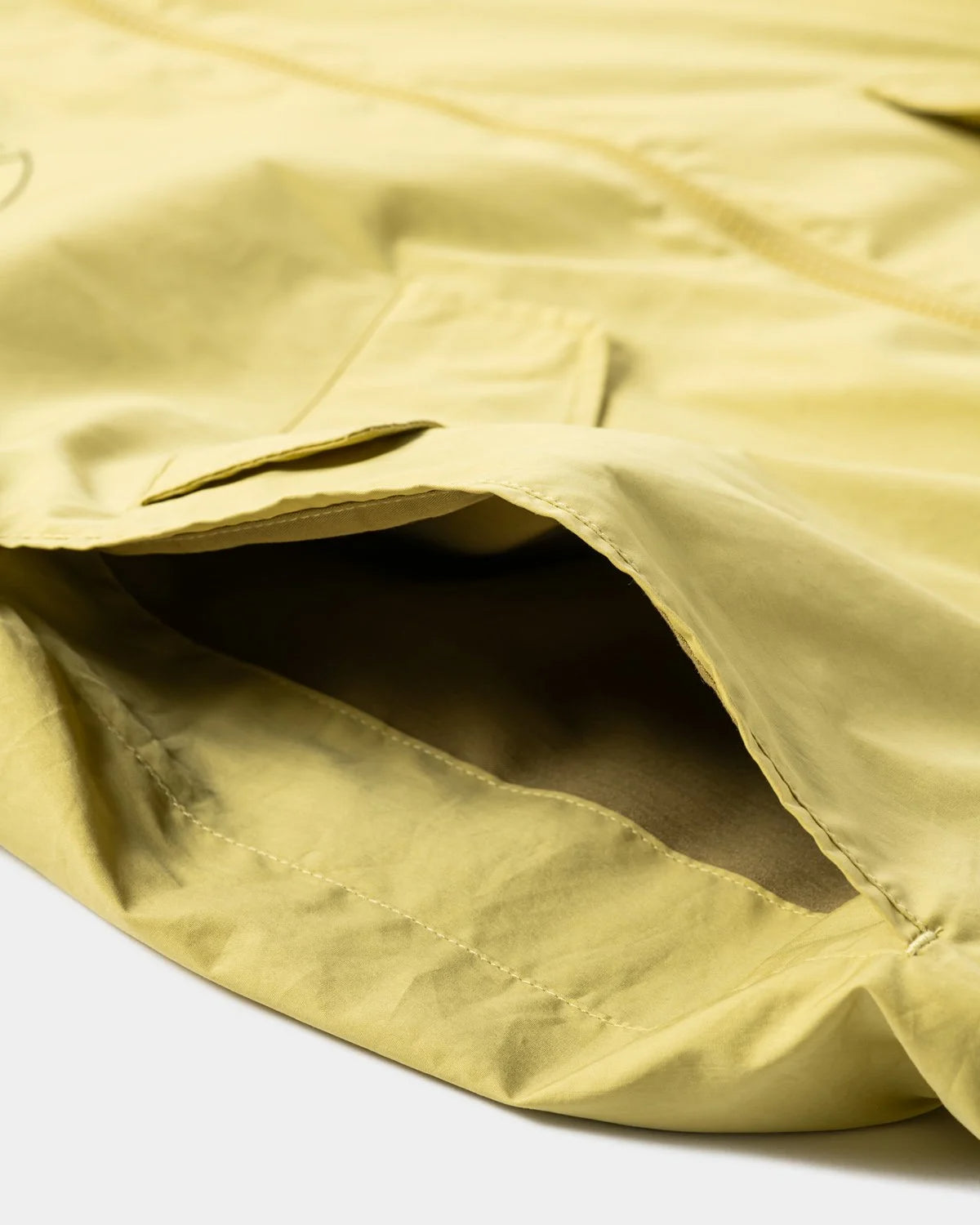 In addition to angled flap pockets on both sides, there are also slash pockets.