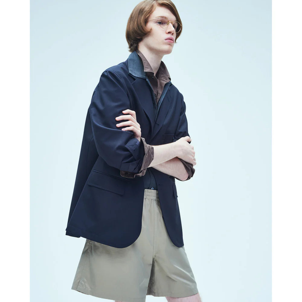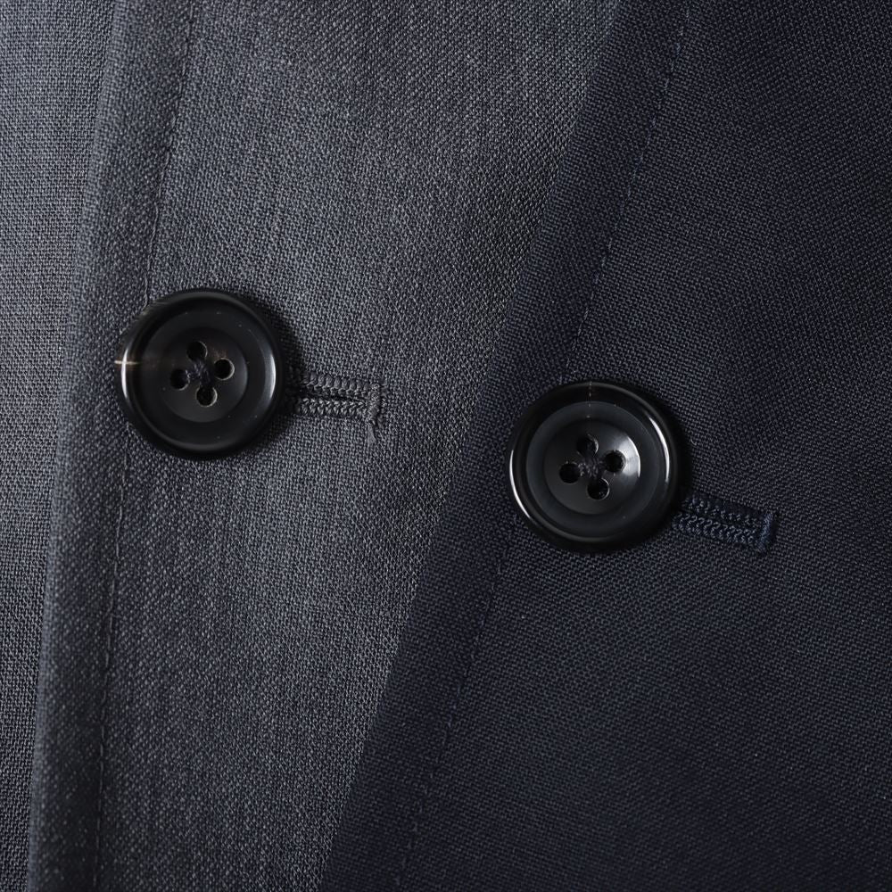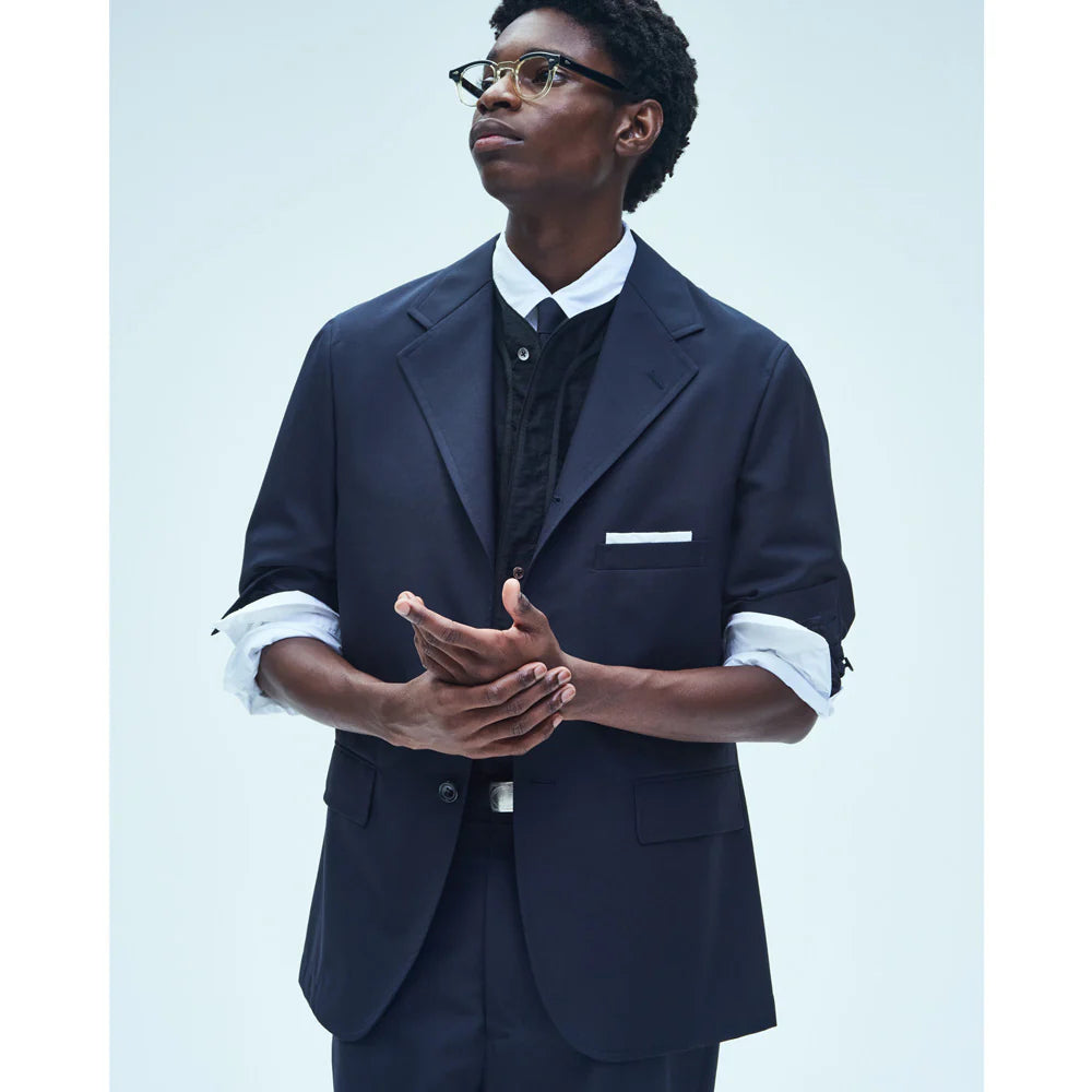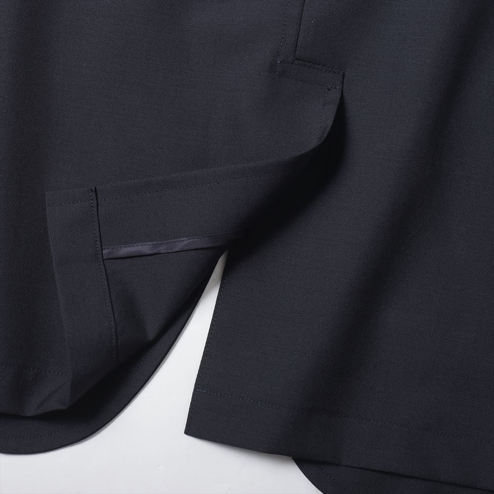 Based on a 1960s sports coat, the three-button notch lapel with a center hook vent combines with elements from the 1960s, including the distinctive 1970s lapels, extremely low chest welt pockets, and sloping shoulders, creating a unique balance.