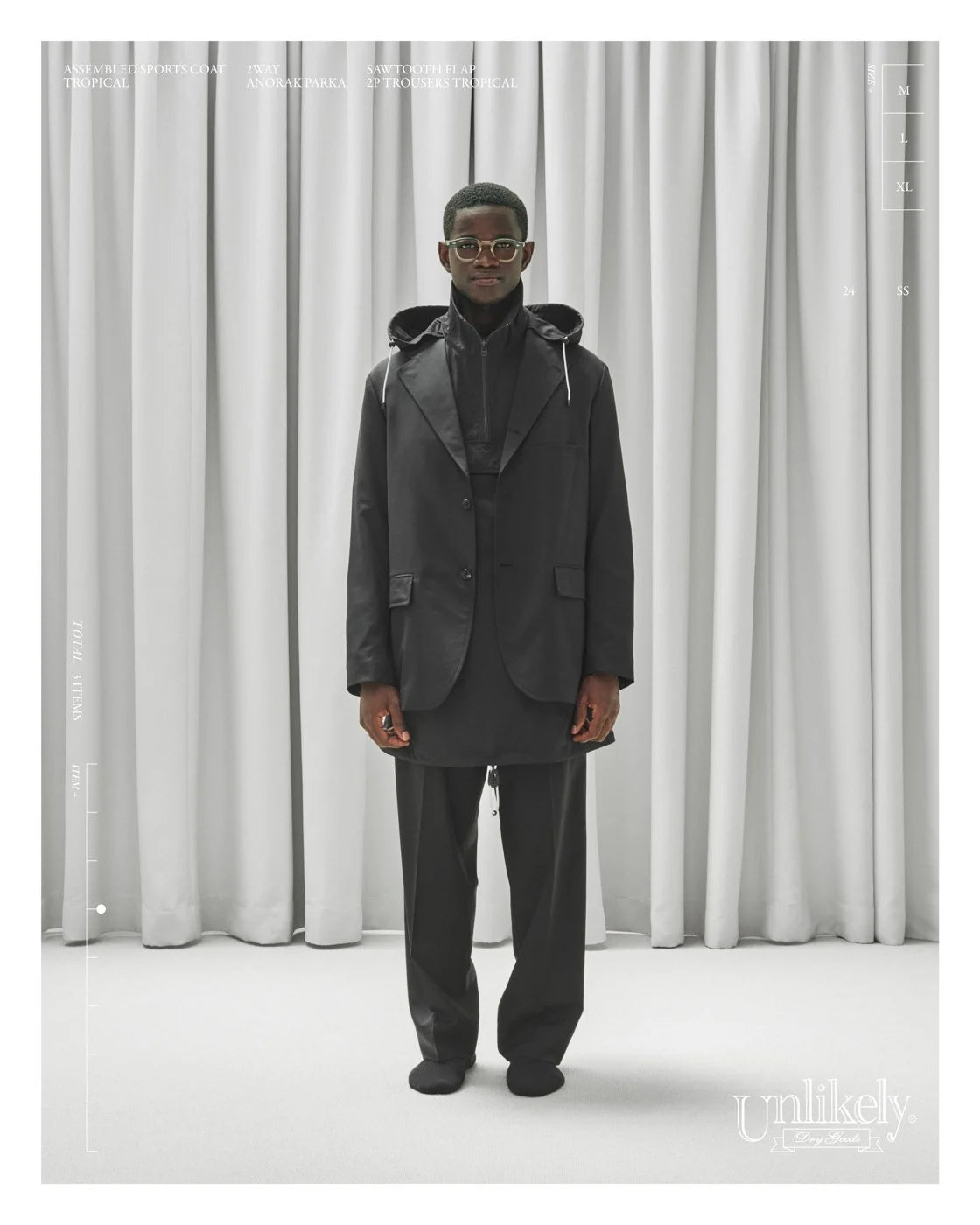 2P trousers are the signature item of the Unlikely brand. The characteristic wool trousers have a deep rise and large hips, and are slightly tapered towards the hem. An unusual feature is that the flap of the coin pocket has a sawtooth design used on cowboy shirts. We have created a pop arrangement that will make you smile when you tuck in your shirt. Like the jacket, one side of the pocket bag fabric is made of polyester mesh fabric to provide breathability.