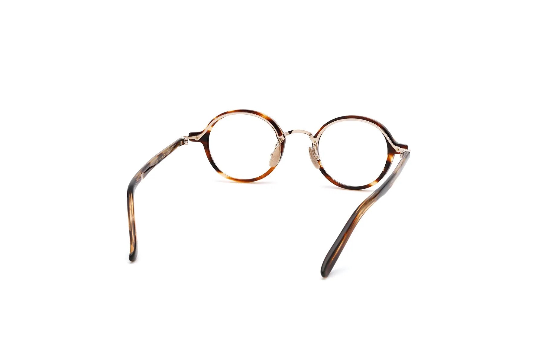 Yellows Plus' round-shaped combination frame SPENCER. A small combination frame made of titanium and acetate. To complement the strength of the thin acetate rim, a back rim is fixed to the back of the front with a titanium part, providing strength and design. The bridge, end piece, and temple core are beautifully carved, creating an elegant and intellectual atmosphere.